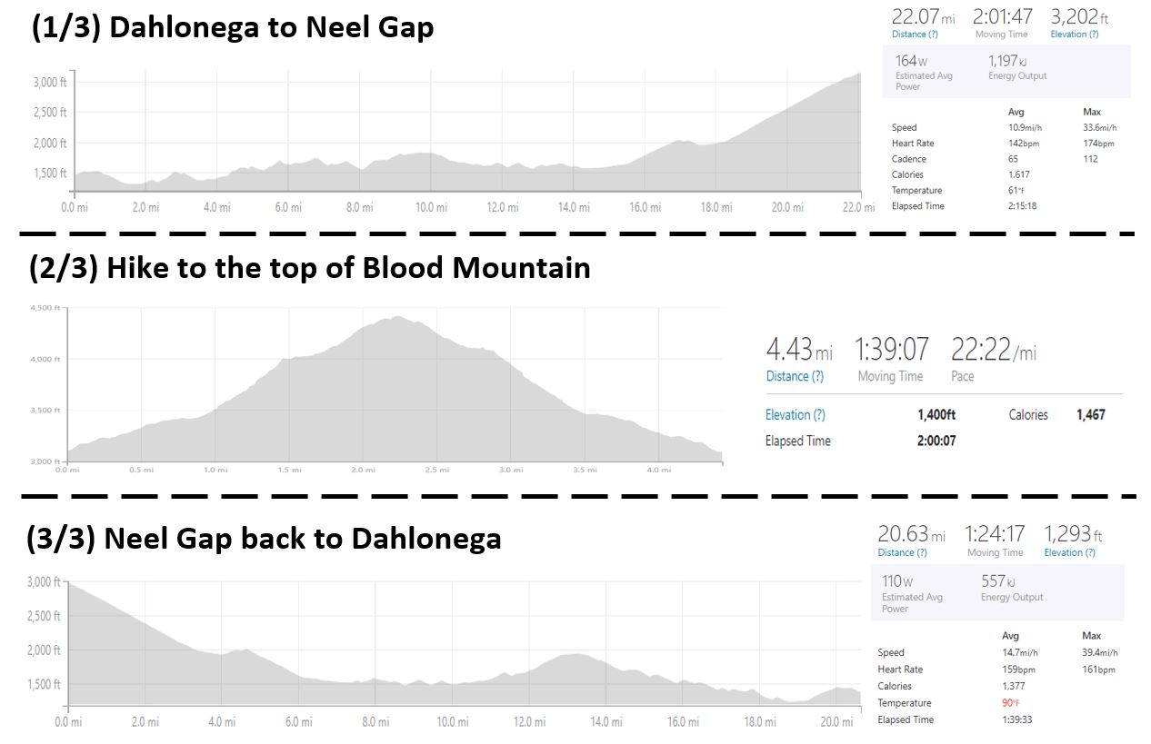 The unofficial Dahlonega Dualthon. Bike from Dahlonega to Neel Gap, hike from Neel Gap to the highest point on the Appalachian Trail in Georgia, Blood Mountain, and hike back to Neel Gap and finally bike back from Neels Gap to Dahlonega. All for a combined total of 48 miles and nearly 6,000 feet of elevation gain completed in about 6 hours.