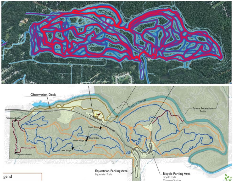 Rogue trails: Rogue trails are the biggest problem with the trail system at Yellow River Park. Compare Strava’s Heatmap of the trail system to the trail map. Look at all those extra trails that are not on the map. Those extra trails lead to a lot of confusion while out there. Now you have hundreds of extra intersections without adequate signage.